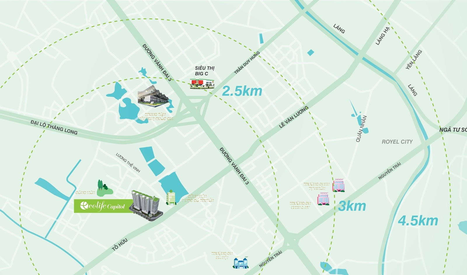 Dự án chung cư Ecolife Capitol nằm trong khu vực trung tâm hành chính và kinh tế của Thủ Đô được quy hoạch và đầu tư xây dựng hạ tầng đồng bộ, trên trục đường chính Tố Hữu (số 58 Lê Văn Lương kéo dài).